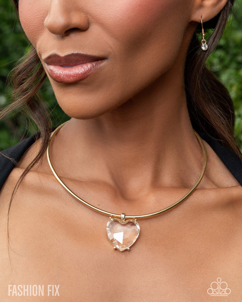 Pronged in gold fittings, a faceted, transparent heart-shaped acrylic swings along a glistening, gold cascade chain below the collar for a whimsical look. Features an adjustable clasp closure.