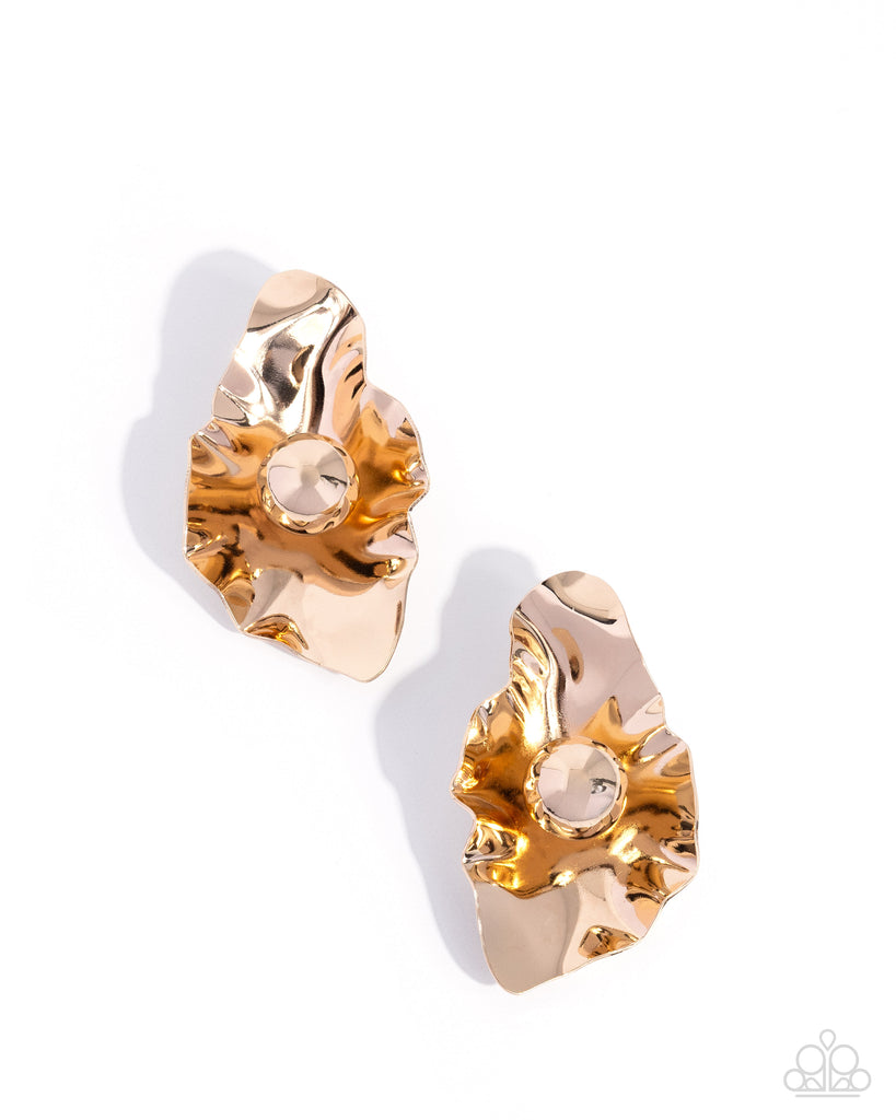 Stemming from an elevated, glistening gold post, a crinkled leaf-like display of gold fans out atop the ear for an audaciously abstract display. Earring attaches to a standard post fitting.