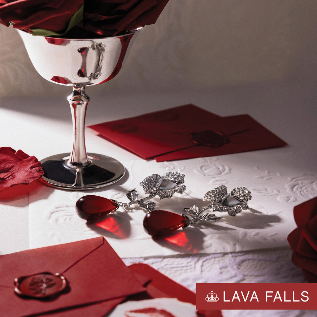 Dusted with dainty white rhinestones, a three-dimensional silver rose, complete with a stem and textured leaves, blooms atop the ear, giving way to a floral-capped, transparent Lava Falls teardrop bead for a dramatically dazzling display. Earring attaches to a standard post fitting.