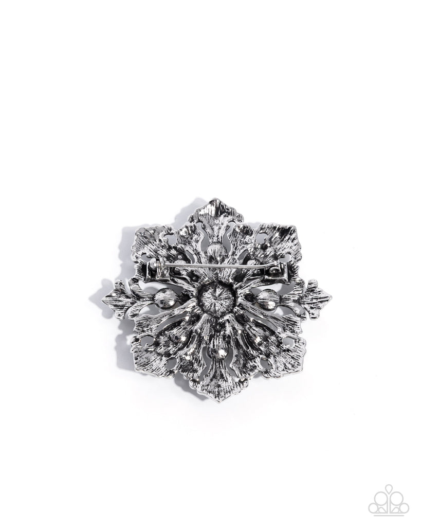 Embellished with glossy white pearls in varying sizes and dainty white rhinestones, a vintage, textured silver flower brooch blooms for an adorably antiqued look. Brooch measures approximately 2 1/2" in length and 2 1/2" in width.